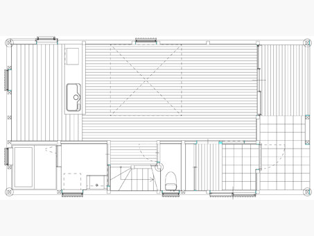 3枚引き違いの大開口サッシと、ほぼ真ん中にある吹抜けで家全体に一体感を持たせて、狭小地でもトップライトから入る光で家中の明るさを確保できます。